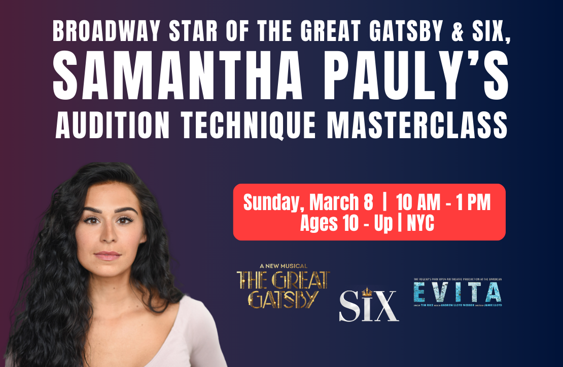 Drama Desk Winner & Broadway Star, Samantha Pauly of THE GREAT GATSBY (Jordan Baker!) and SIX THE MUSICAL (Katherine Howard!) is back to teach an in-person masterclass on March 8th! Samantha also famously portrayed the role of Eva Peron in the West End revival of EVITA at Regent’s Park Open Air Theatre. In addition to starring on Broadway and the West End, Samantha has starred in many regional productions including HONEYMOON IN VEGAS, the 1st National Tour of BAT OUT OF HELL and ELF.
